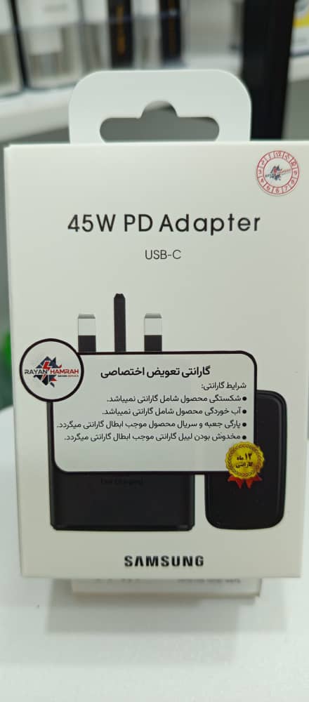 سبد شارژر 45 وات سامسونگ اورجینال برد سولوم مشکی اصلی ،سه خازن سیم پیچ مس، دارای قابلیت شارژ فوق سریع 2 و گارانتی یک ساله رایان سرویس