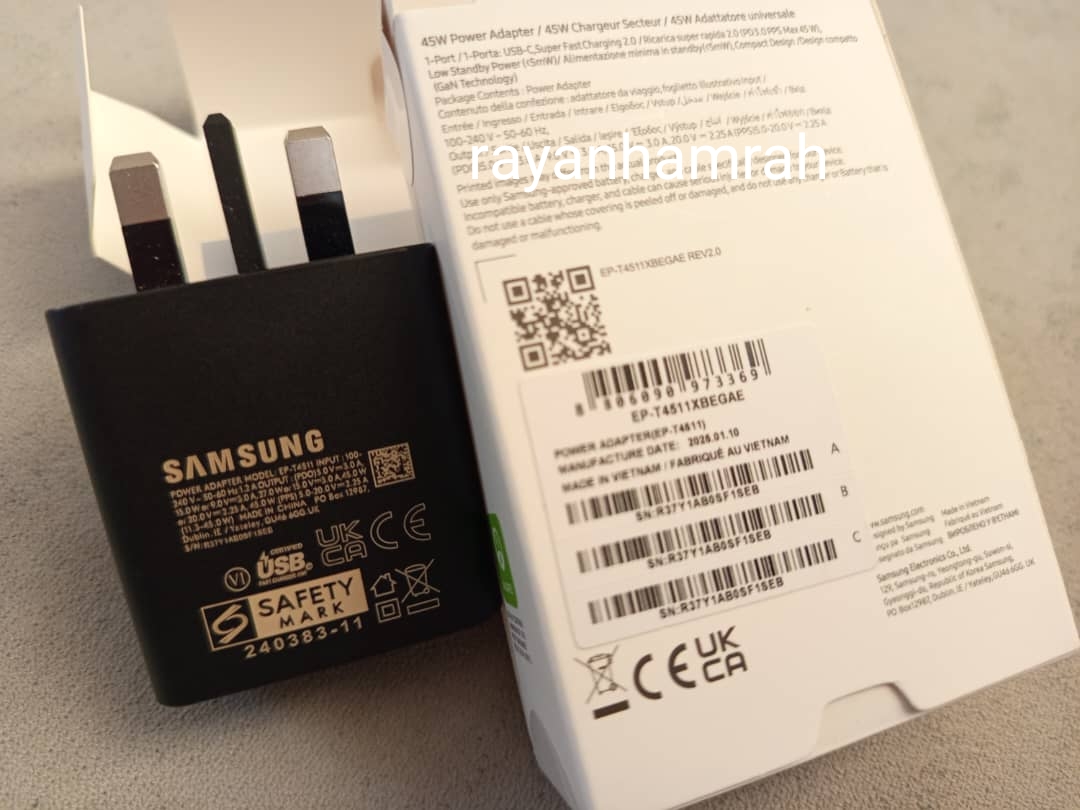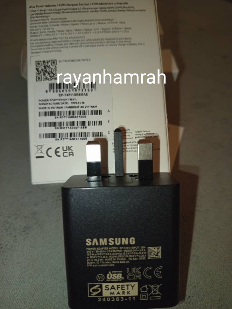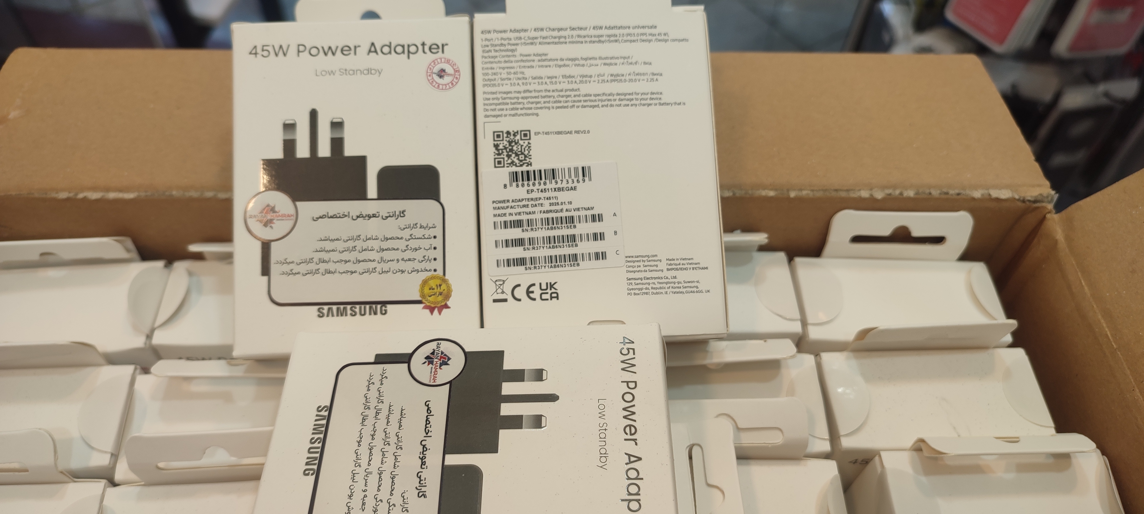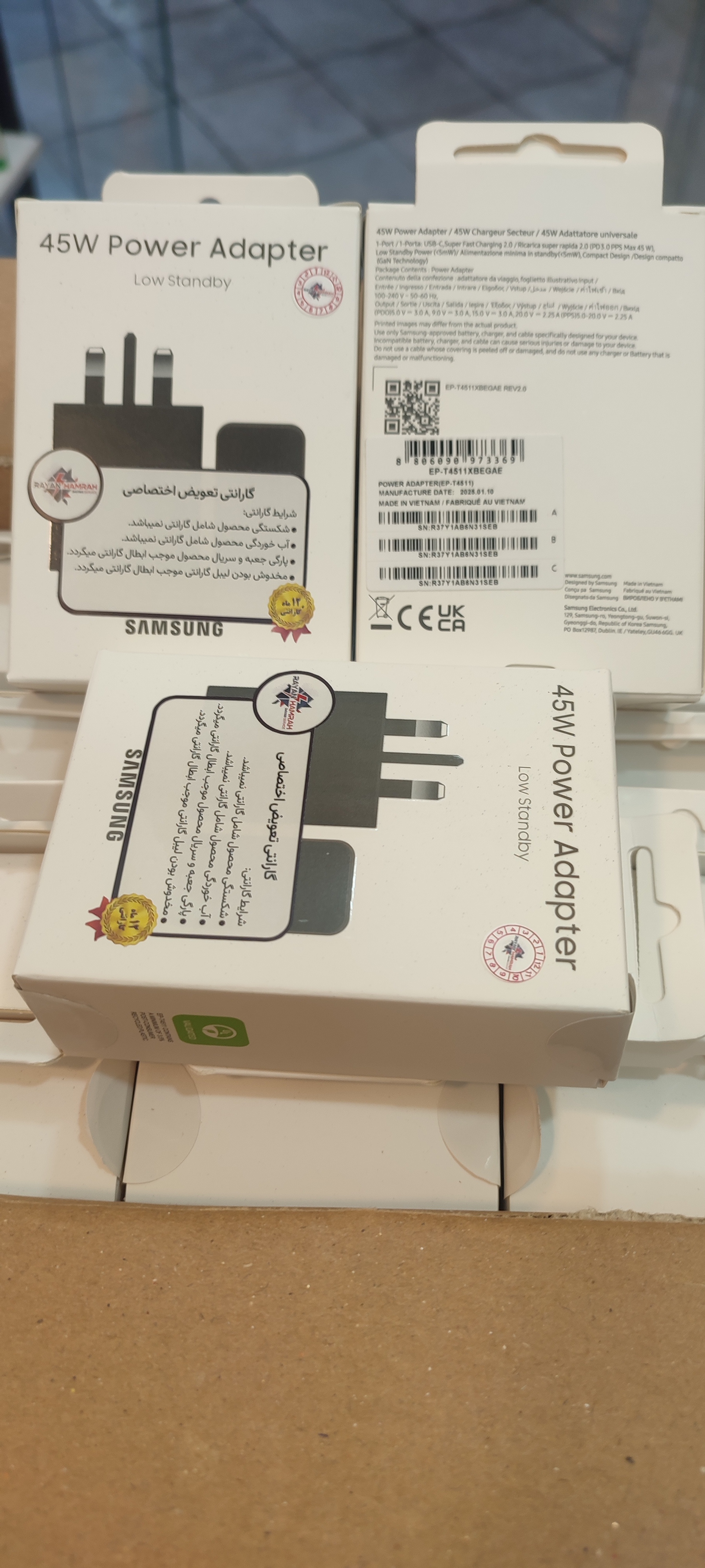 شارژر 45 وات سامسونگ 100% اورجینال , low standby ،دارای NFC ✅نیو پک مدل 4511✅ دارای برد مشکی سولوم اورجینال ( اورجینال سامسونگ)✅دارای NFC✅قابلیت استعلام اصالت کالا از سایت سامسونگ✅سوپر فست ۲✅ همراه با گارانتی یکساله رایان سرویس